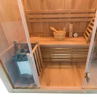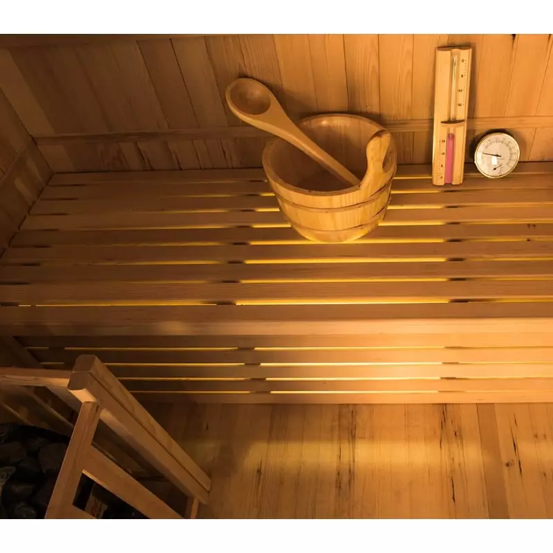Contrairement à son nom, le sauna vapeur diffuse principalement une chaleur sèche. La « vapeur » apparaît lorsque l’on verse de l’eau sur les pierres volcaniques chauffées du poêle, créant une montée de température rapide pouvant atteindre jusqu’à 80°C. Cette chaleur enveloppante stimule la transpiration, libère les tensions accumulées et procure une détente musculaire immédiate.
