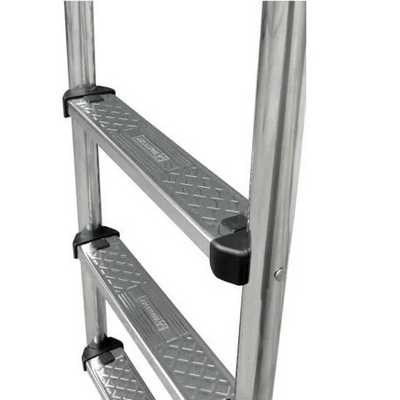 Une échelle standard de 3 marches, avec main courante. Elle est fabriquée en tubes de diamètre 43 mm en acier inoxydable poli. Les marches sont en acier inox AISI-304 et plastique. Elle est livrée complète, avec ancrages de fixation.