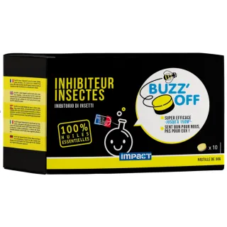 Buzz'Off est une pastille destinée à repousser tous les insectes (abeilles, guêpes, mouches, moustiques...) de la surface d'une piscine.